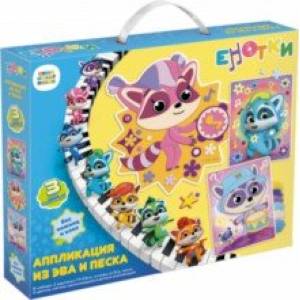С помощью набора аппликаций с любимыми героями нового популярного мультфильма 'Енотки' детки смогут легко и просто сделать веселые картинки в разных техниках. Это интересно и безопасно, т.к. для создания аккуратных аппликаций не потребуются клей и ножницы. Один набор - это разноцветные картинки из песка и мягкой самоклеящейся мозаики EVA! Увлекательное и полезное занятие, интересная игра, красивый декор детской комнаты!