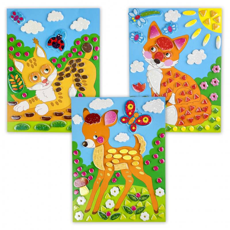 В комплекте: 3 цветные картонные основы с рисунком, разноцветные самоклеящиеся детали из ЭВА, цветная листовка.
