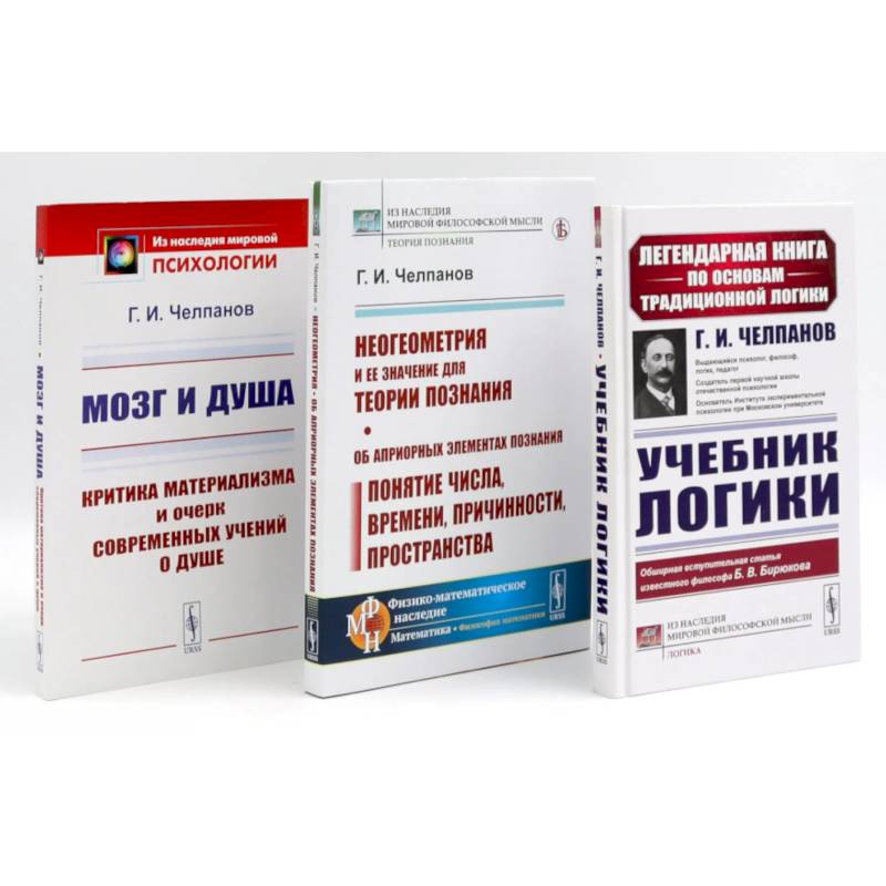 Комплект содержит книги. «Учебник логики» Вниманию читателей предлагается знаменитый учебник логики, написанный выдающимся русским философом, логиком и психологом Г.И. Челпановым. Это было лучшее учебное пособие по нематематической логике, предназначенное для гимназического курса; учебник был отмечен Премией императора Петра Великого и только до революции выдержал девять изданий. В 1918 г. челпановский «Учебник логики» вышел десятым изданием, а в 1946 г., когда было принято решение о введении логики и психологии в средней школе, также выходил, но в сокращенном виде. В данной книге приводится текст последнего полного издания, в новом осовремененном оформлении. Текст Челпанова предваряют 45 страниц обширной вступительной статьи Б. В. Бирюкова «О Г.И. Челпанове - выдающемся русском психологе, философе, логике; Жизненный и творческий путь. Проблема сознания. Философские взгляды. Психологический институт. Учебник логики. Г. И. Челпанов в пореволюционные времена. 'Возвращение' Челпанова». Это книга по так называемой традиционной логике. Подробное изложение категорической силлогистики составляет одно из главных достоинств книги. Учение об отношении между понятиями по их объему, закон обратного отношения между содержанием и объемом понятийных образований нашего ума, теория категорических силлогизмов, условных и разделительных умозаключений, учение об индуктивных методах исследования причинных связей вещей - все это просто и ясно изложено Челпановым. Весьма существенным является то, что в челпановском руководстве полностью изложена ассерторическая силлогистика. Это значит, что читателю явлена завершенная логическая система, которая позволяет усвоить основную идею логики - формализацию отношения логического следования и эвристического рассуждения. Книга предназначена прежде всего для студентов вузов, изучающих логику, и преподавателей, но будет также полезна всем, кто желает ознакомиться с этой дисциплиной самостоятельно. «Неогеометрия и ее значение для теории познания. Об априорных элементах познания (понятие числа, времени, причинности, пространства)» Книга рекомендуется философам, историкам и методологам науки, аспирантам и студентам философских факультетов вузов, всем читателям, интересующимся вопросами теории познания и философии науки. «Мозг и душа» Предлагаемая читателю книга принадлежит перу выдающегося русского философа и психолога Г.И. Челпанова, судьба и профессиональный путь которого были тесно связаны с полной драматизма историей России и логикой развития отечественной психологии XX века, неотделимой от движения мировой психологической мысли. В настоящей книге представлен критический очерк некоторых современных автору учений о душе. Г. И. Челпанов обосновывает самостоятельность предмета психологии, опираясь на принцип «эмпирического параллелизма», сформулированный в ходе развития идей В. Вундта. Книга рекомендуется психологам, философам, историкам науки, а также широкому кругу читателей, интересующихся проблемами развития психологического знания.