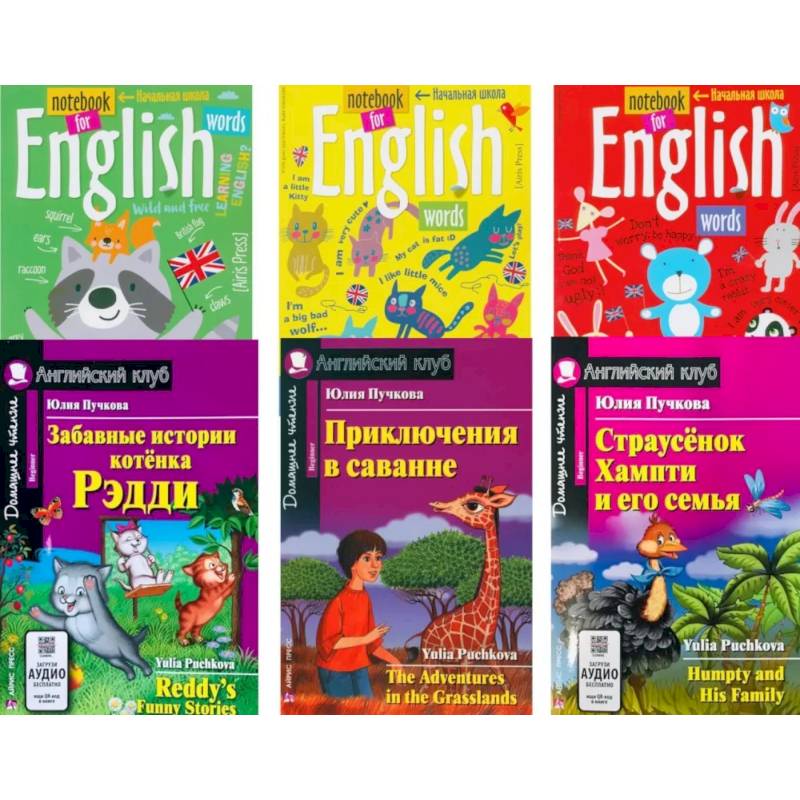 В комплект вошли три тетради для записи английских слов и три книги уровня Beginner на английском языке: